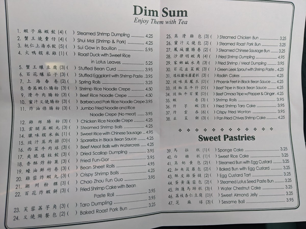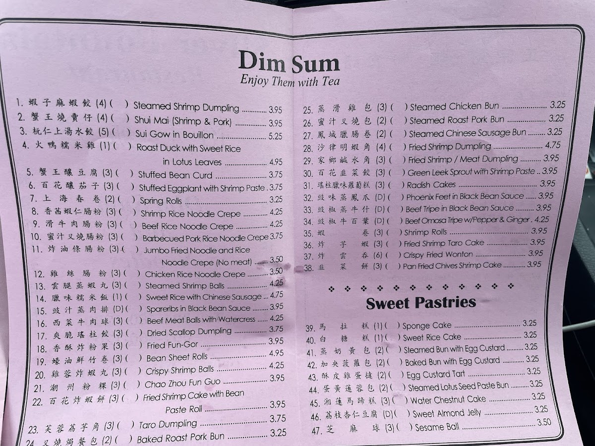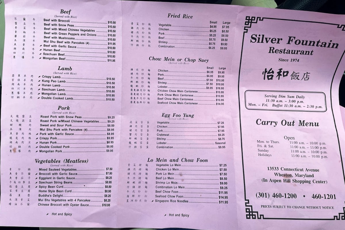 Silver Fountain’s menu is suitable for casual dining occasions such as brunch or lunch, with options for quick ordering particularly during weekdays when dim sum is ordered from menus rather than push carts. On weekends, dim sum is typically served via carts, allowing diners to select dishes as they pass by. The menu covers a diverse range of traditional dim sum and Chinese dishes catering to different tastes within the dim sum dining experience.